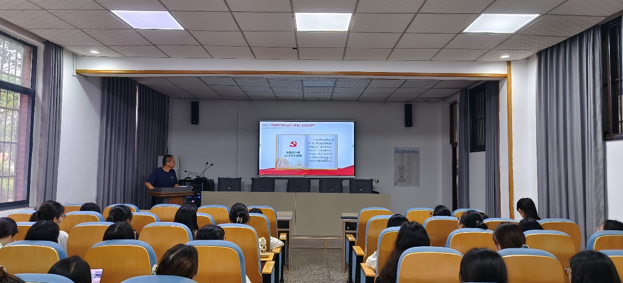 本科生第二党支部书记易临群给大家带来了“筑牢思想防线 严守纪律底线”的党纪学习教育专题党课,她分别从三个方面进行讲授:一是在思想境界上,要强化四种意识,即必须增强党的意识、群众意识、责任意识和自律意识;二是在道德修养上,要做到“五慎”,即要慎初、慎独、慎友、慎言和慎好;三是在实际行动上,要把好“三关”,即把好家庭廉政关、重点岗位关和廉政监督关。她最后提到四句话与在座党员同志们共勉:政治上跟党走、经济上莫伸手、作风上解民忧和工作上争上游。
