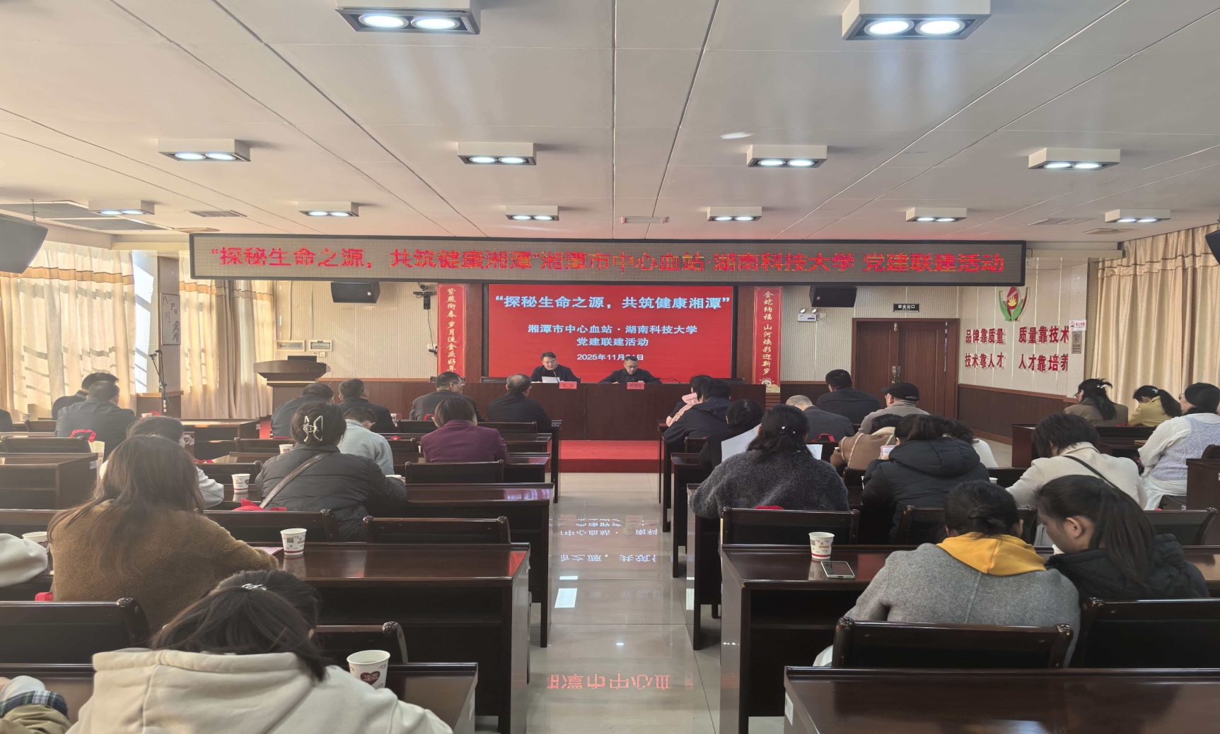 11月21日,AV影片直播 与湘潭市中心血站开展党建联建活动,通过理论学习、科普宣讲与实践参观相结合的方式,推动无偿献血公益事业与高校思政教育深度融合。市中心血站党总支书记张俊良,AV影片直播 党委书记龙赢、党委副书记舒艳及学院师生党员代表出席本次活动。
