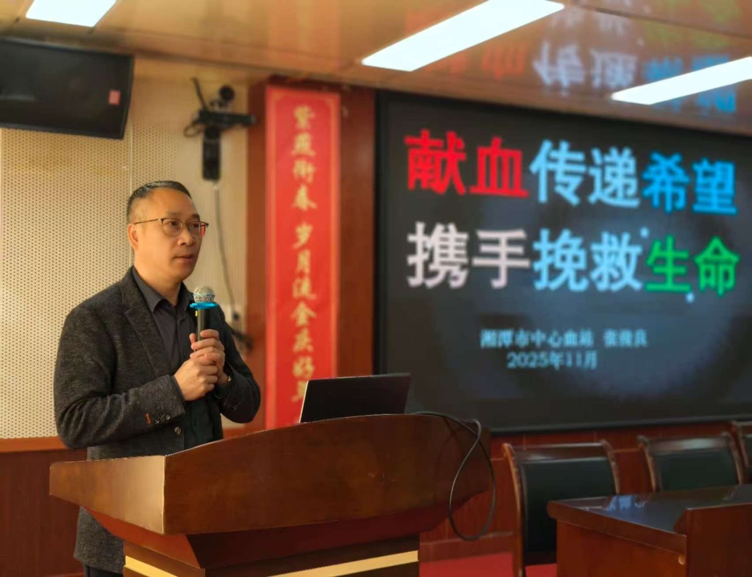 随后,市中心血站党总支书记张俊良以"献血传递希望 携手挽救生命"为主题,进行无偿献血知识科普,系统的讲解血液生理知识、献血安全规范及临床用血需求。他以湘潭市年均需10万单位血液才能满足临床救治的数据为例,强调"每一份献血都是生命的礼物",并针对师生关注的"献血是否影响健康""献血前后注意事项"等问题进行专业解答。