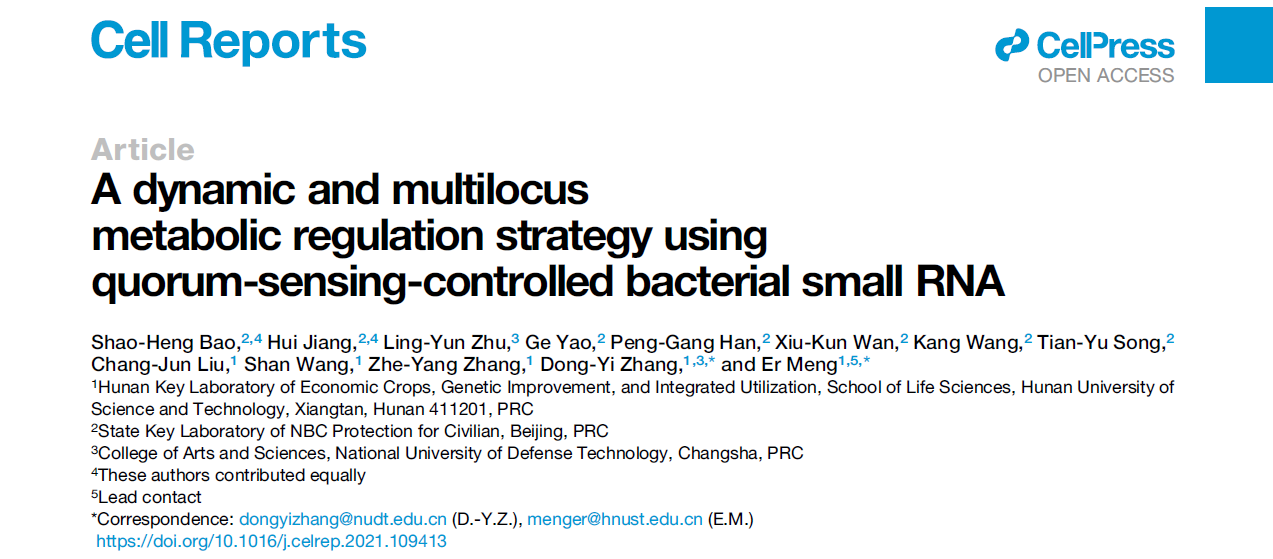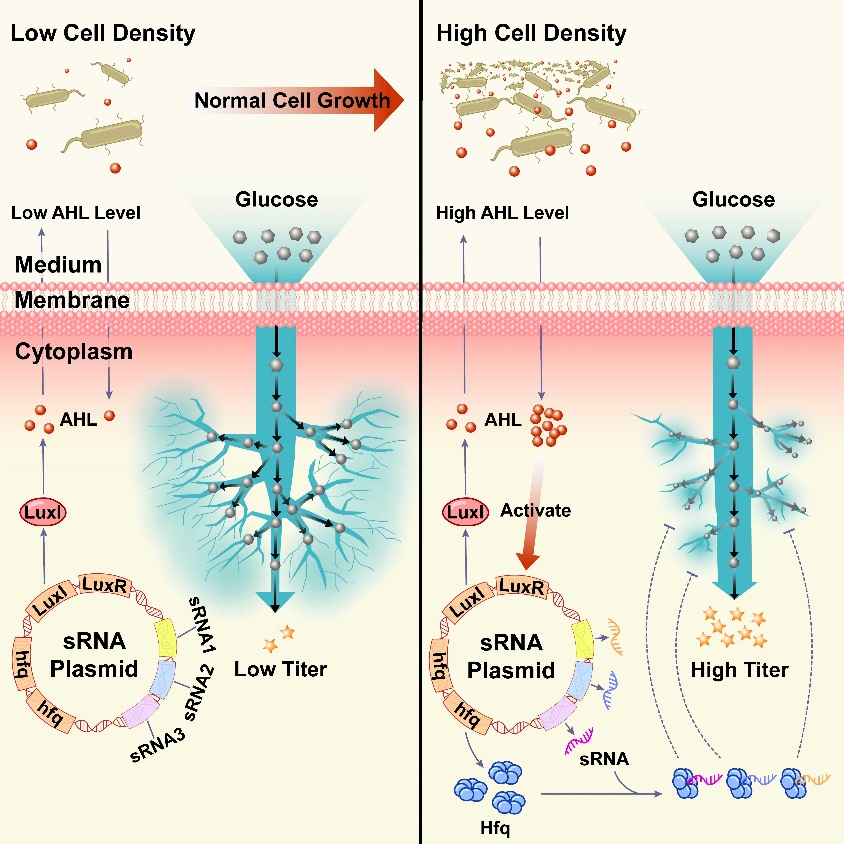 为开发动态调控多个代谢途径的高效代谢调控手段,AV影片直播 合成生物学课题组与国民核生化灾害防护国家重点实验室联合发表Cell Reports文章“A dynamic and multilocus metabolic regulation strategy using quorum-sensing-controlled bacterial small RNA”,本文的通讯作者为张东裔教授与孟尔副教授,第一作者为鲍邵衡博士。该文报道了一种基于群体感应系统和抑制型小RNA的代谢网络动态调控策略。该策略在低细胞密度环境下不抑制基因表达;而在高细胞密度环境下有效抑制多个基因的mRNA翻译过程。经过数学建模预测,团队筛选了转录因子LuxR的多个突变体,精确、动态调控分子伴侣Hfq的表达水平,成功实现了在不影响细胞生长的条件下有效抑制多个生长必需基因的表达水平。此外,该策略还应用于包括蒎烯(Pinene)、并环萜烯(Pentalenene)以及裸盖菇素(Psilocybin)在内的多个高价值产物的合成研究中。团队通过挖掘48个大肠杆菌内源基因,发现还原型辅酶II(NADPH)是合成萜类产物蒎烯与并环萜烯的重要原料,并通过组合抑制手段成功将蒎烯与并环萜烯的合成滴度分别提升了365.3%和79.5%。此外,该策略还应用于吲哚类产物裸盖菇素的合成研究中,利用组合抑制手段成功将其滴度提升了302.9%,充分验证了该策略具有广泛的目标物普适性。