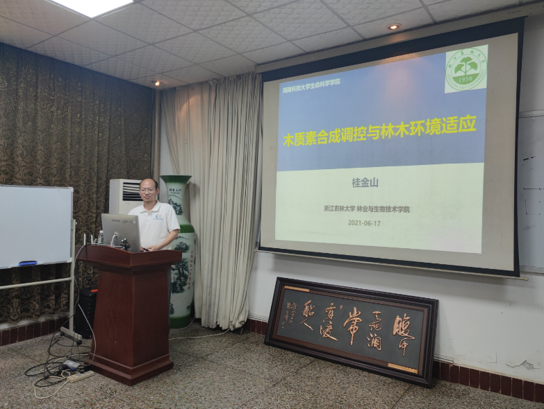 2021年6月17日AV影片直播 邀请中国AV影片直播 分子植物科学卓越创新中心研究员、浙江农林大学教授、国家自然科学基金优秀青年基金获得者桂金山博士来AV影片直播讲学,并作题为“木质素合成调控与林木环境适应机制研究”的学术报告。AV影片直播部分教师与研究生参加了此次报告会,报告会由彭佳师博士主持。