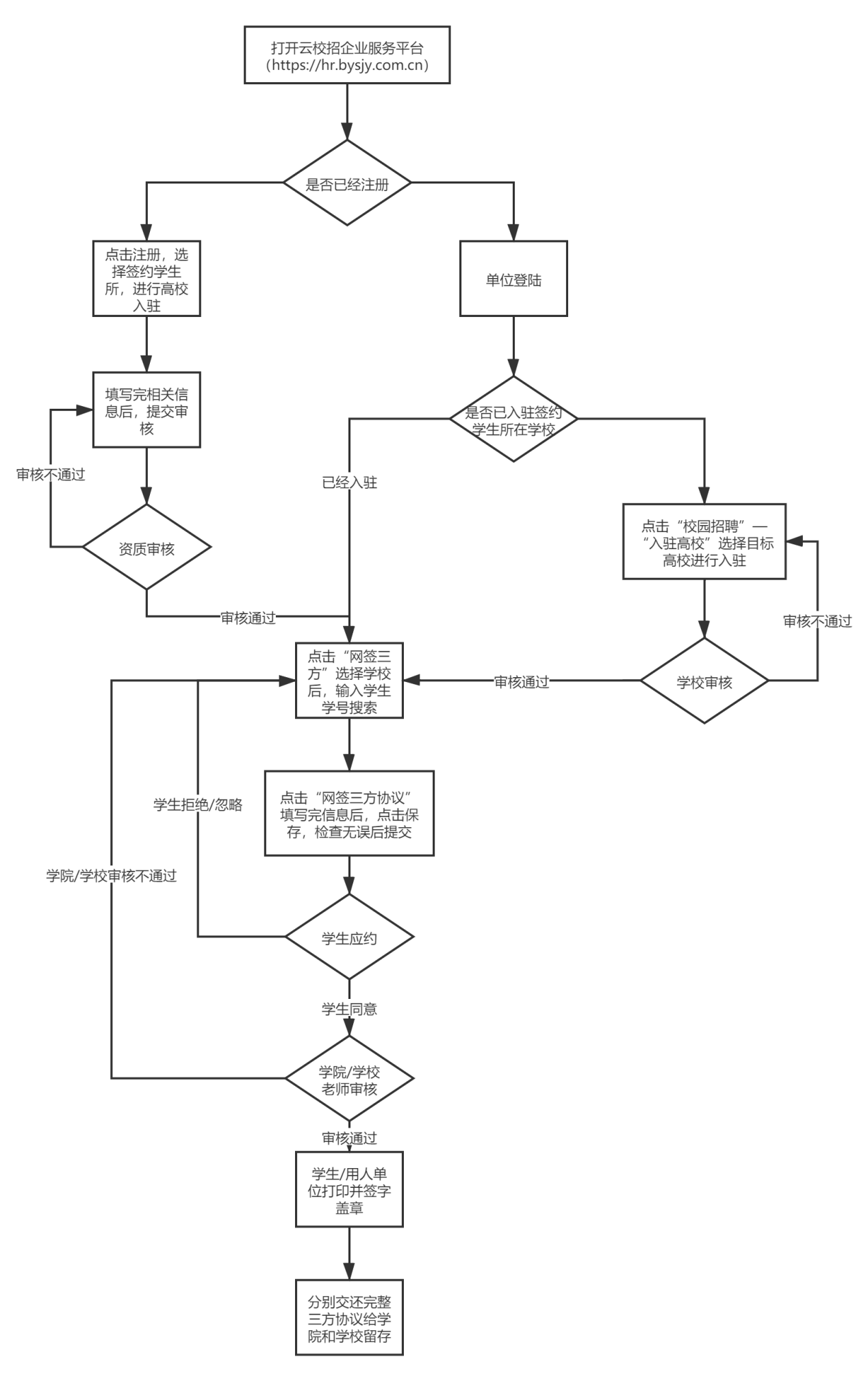 ②学生和用人单位已经明确签约意向,但是该单位还未注册过学校云就业平台,此时需要用人单位先进行注册,在学校审核通过后再在网签三方中对学生发起签约邀请(详见附件一)