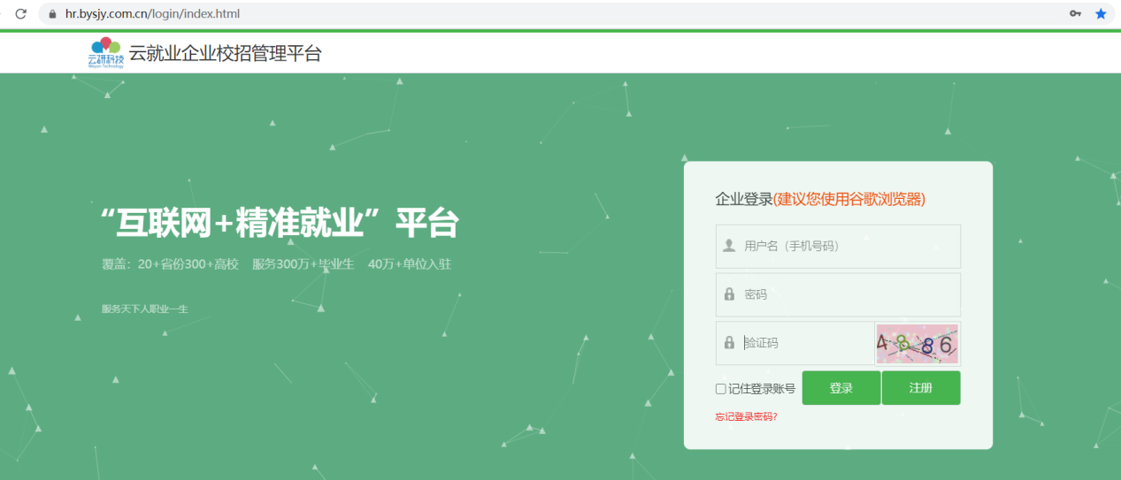 第一步:登陆云校招企业服务平台()没注册账号的,点击页面上注册按钮先行注册,等审核通过后再进行网签。