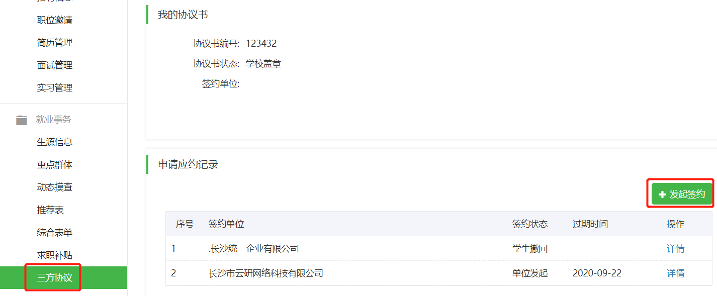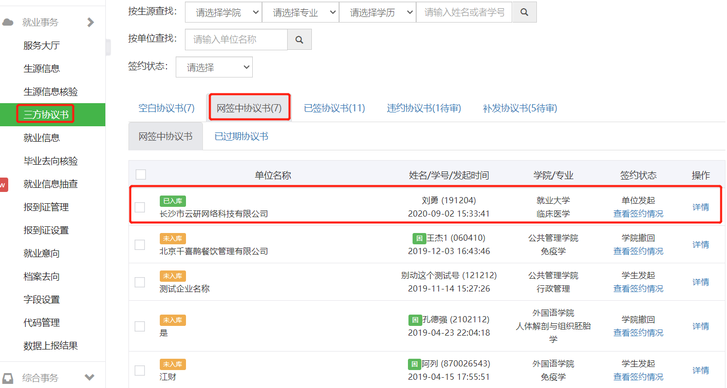 第一步:无论是单位发起的网签,还是学生申请的网签,都是在网签中的协议书中查看,点击详情可以查看学生和用人单位签约信息