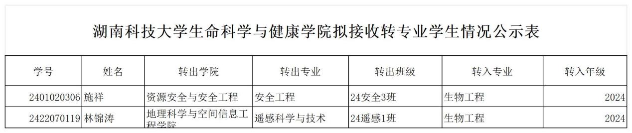 根据《AV影片直播 普通全日制本科生转专业管理办法(试行)》(科大政发〔2024〕81号)和《AV影片直播 转专业管理办法》(院发〔2024〕38号)等文件精神,经学生本人申请、转专业工作领导小组面试、教务办审查,拟同意施祥、林锦涛2名同学由外院转入AV影片直播生物工程专业学习。现将转专业名单进行公示。