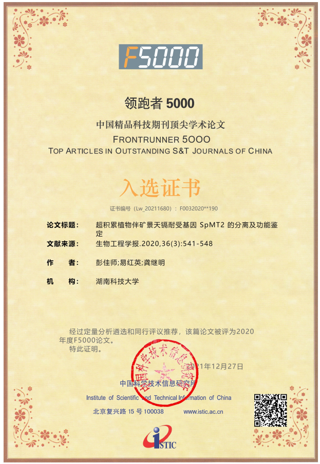彭佳师博士完成的论文“超积累植物伴矿景天镉耐受基因 SpMT2 的分离及功能鉴定”入选,该论文发表在2020年度的《生物工程学报》(第36卷第3期)上。