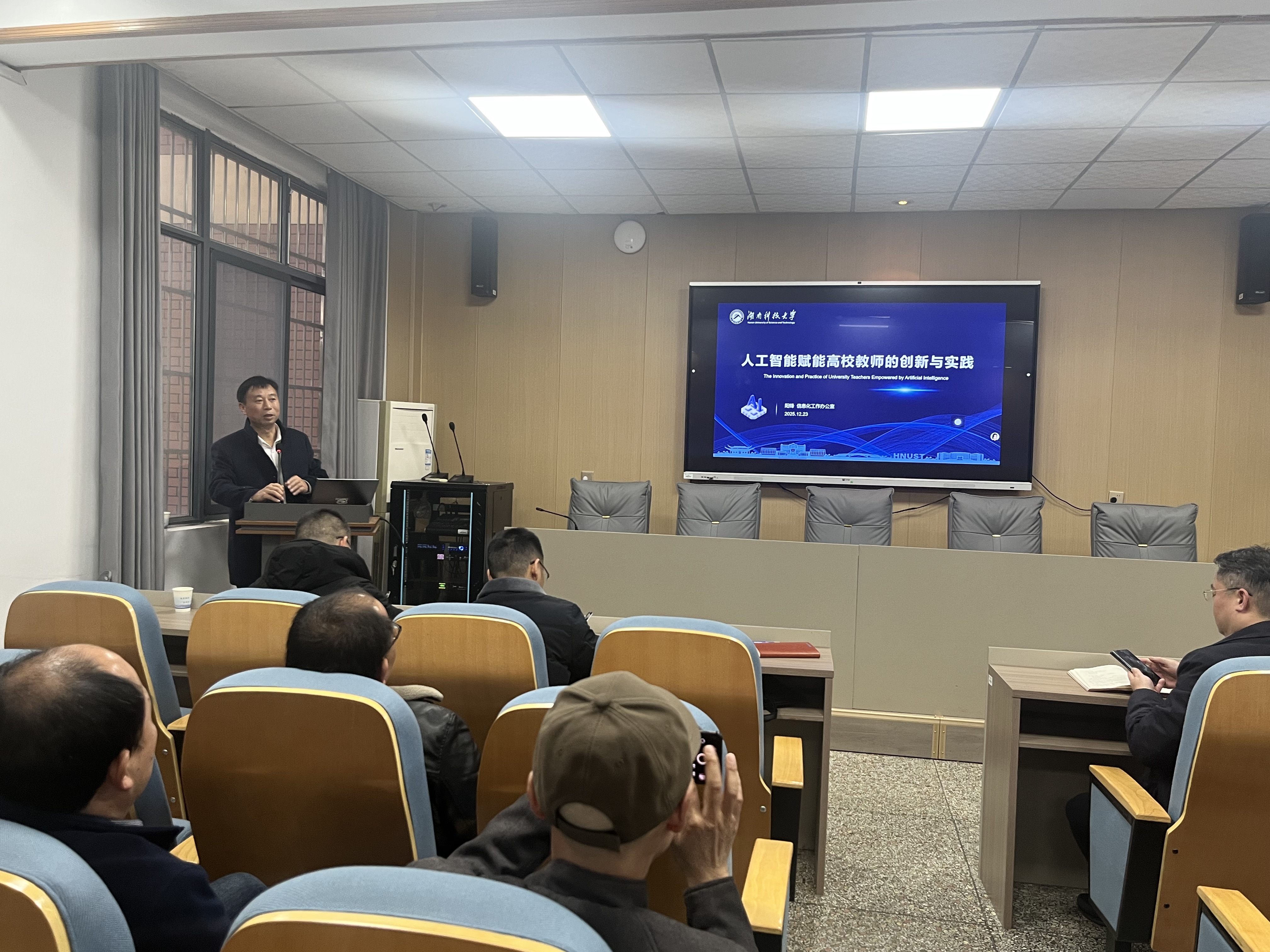 随后,会议邀请信息化工作办公室阳锋主任作题为“AI赋能高校教师的创新与实践”的专题讲座。阳主任结合当前人工智能技术发展趋势,深入浅出地介绍了AI在教育领域的创新应用与实践路径,为教师们利用智能技术革新教学科研模式提供了有益思路和借鉴。