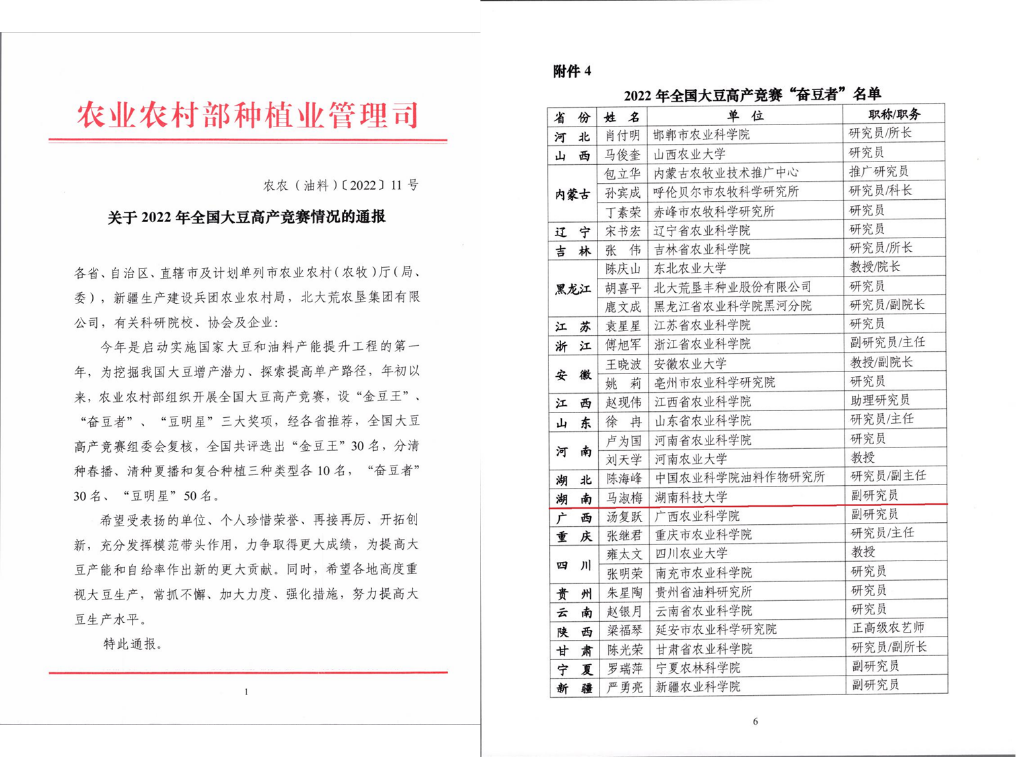 12月30日,农业农村部种植业管理司发布了《关于2022年全国大豆高产竞赛情况的通报》,AV影片直播马淑梅副教授(原副研究员)荣获“2022年全国大豆高产竞赛“奋豆者”奖项。