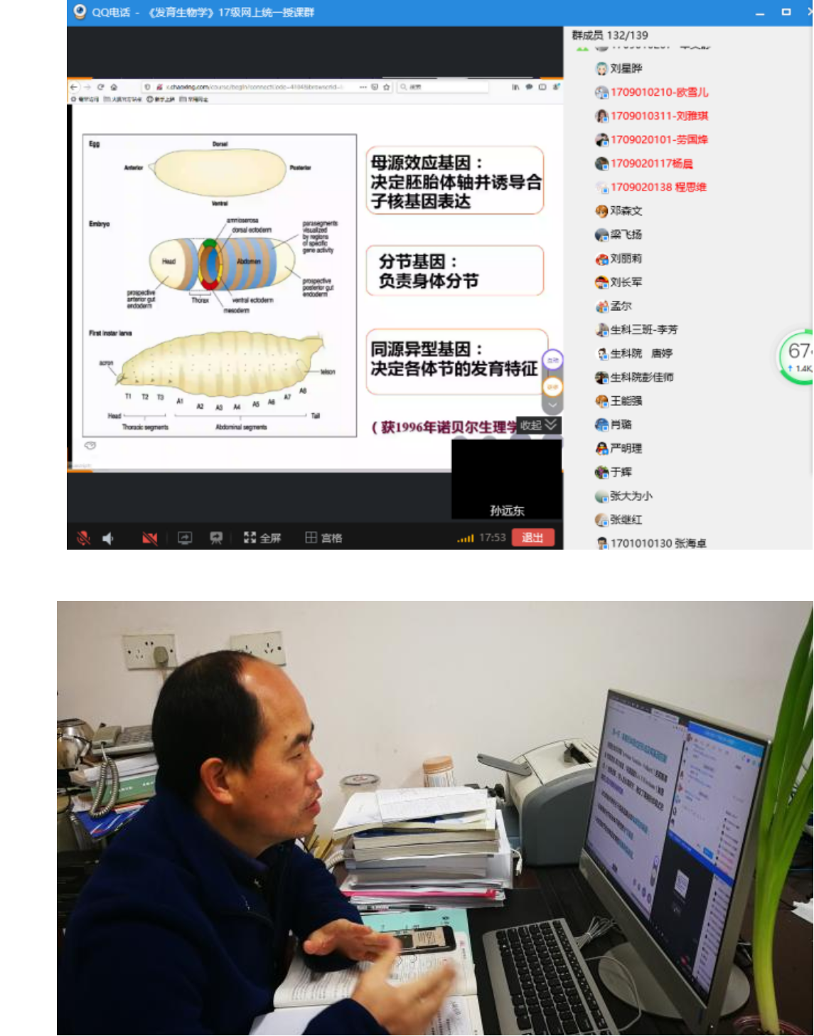 4月2日上午10点,AV影片直播本学期第一堂线上公开课在孙远东老师的发育生物学QQ学习群里开播了。课堂里,孙老师细致的讲解了果蝇形体模式的形成及其基因控制,在师生互动环节中学生主动分享了相关专业人物的科研小故事,专业学习和课程思政结合的紧密无痕。